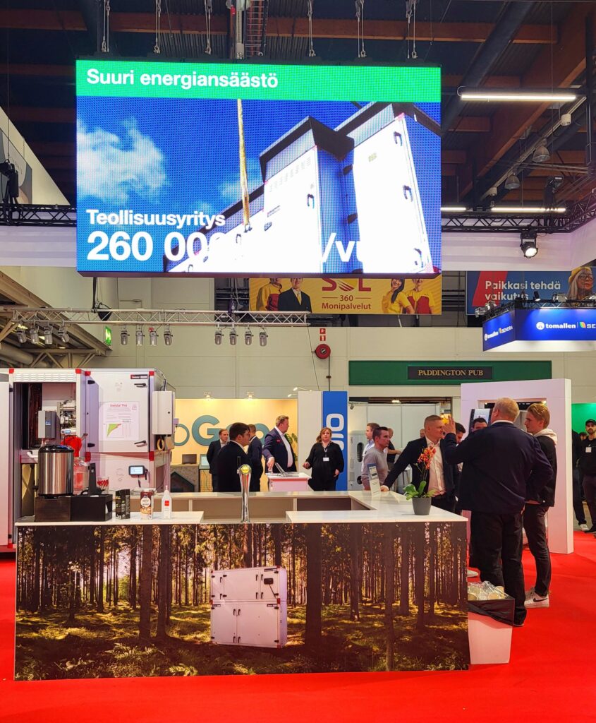 Meidän osastollamme on esittelyssä EcoHeater-poistoilmakone integroidulla lämpöpumpulla. EcoHeater on erityisesti kerrostalojen ilmanvaihtoon suunniteltu poistoilmakone, joka ottaa talteen poistoilman lämmön. Talteenotetulla lämmöllä voidaan lämmittää vettä, jota voidaan käyttää vaikkapa patterijärjestelmään tai lämpimän käyttöveden varaamiseen.